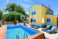 Der Hof ist komplett umzäunt und verfügt über einen Parkplatz, einen Loungebereich, einen Swimmingpool mit eingerichteter Liegewiese, eine Grillterrasse und eine Taverne.