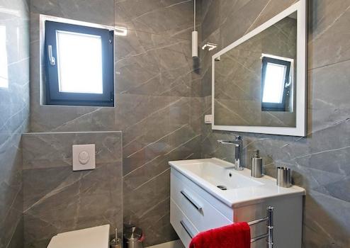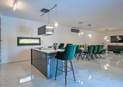 An der südöstlichen Küste Istriens, wo grüne Hügel auf das Meer treffen, wo Natur und Erbe aufeinandertreffen, gibt es zwei Städte ähnlicher Größe, aber mit unterschiedlichem, sich aber gegenseitig ergänzendem Charakter – Labin und Rabac. Die malerische Stadt Labin erhebt sich auf einem 320 m hohen Hügel, nur fünf Kilometer von den weißen Kiesstränden in Rabac entfernt. Labin, das für kurze Zeit zur unabhängigen Republik erklärt wurde, ist eng mit der reichen Geschichte und dem Bergbau verbunden, die diese Region prägten, und ist heute eine faszinierende Stadt voller Widersprüche. alt und neu, Geschichte und Gegenwart, Tourismus und Kunst. Unweit der Stadt Labin steht ein elegantes Haus mit Swimmingpool zum Verkauf. Das neu erbaute einstöckige Haus mit klaren Linien wurde mit hochwertigen Materialien gebaut. Das Haus verfügt über Zimmerei mit dreischichtigem metallisiertem Glas, laminierten Innentüren und einbruchsicheren Eingangstüren. Dank der großen Glasflächen wird das Tageslicht optimal genutzt. Das Konzept eines L-förmigen Grundrisses ist klar definiert. Es ist als zwei separate Einheiten für Tag und Nacht konzipiert, die zu einer großen Terrasse zusammengeklappt werden können. Der Wohnbereich besteht aus einer Küche und einem Esszimmer mit Wohnbereich, während der Nachtbereich aus drei Schlafzimmern mit eigenem Bad besteht. Ergänzt wird der Grundriss durch einen Flur, ein Gäste-WC, eine Waschküche und einen Technikraum. Die Beheizung/Kühlung des Hauses erfolgt über Klimaanlagen, nordische Heizkörper und Festbrennstofföfen im Wohnzimmer. Der Hof ist umzäunt und begrünt und verfügt über einen beheizten Salzwasserpool von 32 m² mit einem mit rutschfester R11-Keramik gepflasterten Sonnendeck und Parkplätzen. Dieses Haus mit modernem architektonischem Ausdruck in äußerst ruhiger Lage ist eine ideale Immobilie für das Familienleben oder als Investitionsmöglichkeit zur touristischen Vermietung.