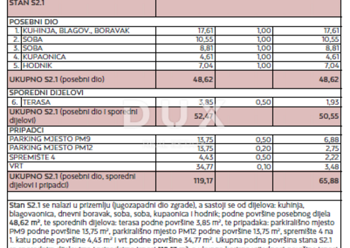 Eine im Bau befindliche Wohnung in Gornji Bilig in Zadar steht zum Verkauf. Die Wohnung mit einer Gesamtwohnfläche von 48,62 m2 befindet sich im Erdgeschoss eines kleineren Wohnhauses mit sechs Wohneinheiten. Es besteht aus einem Wohnzimmer, einer Küche und einem Esszimmer, zwei Schlafzimmern, einem Badezimmer und einem Flur. Zur Wohnung gehören außerdem eine Terrasse, zwei Parkplätze im Hof des Gebäudes, ein Abstellraum und ein Garten von 34,77 m2. Die Gesamtnutzfläche der Wohnung beträgt zusammen mit sämtlichem Zubehör 65,88 m2. Die Wohnung ist voll klimatisiert und die Badezimmer verfügen über Fußbodenheizung. Die Zimmerei besteht aus PVC, Moskitonetze und elektrische Jalousien sind installiert. Die Wärmedämmung an der Fassade besteht aus 10 cm Styropor. Geplanter Einzugstermin ist Mitte 2025. Die Wohnung befindet sich in einem ruhigen Teil der Stadt Zadar, weit weg vom Trubel der Stadt und den stark befahrenen Straßen. In der näheren Umgebung gibt es alle notwendigen Einrichtungen für einen ungestörten Alltag, wie zum Beispiel ein Geschäft, eine Schule, einen Kindergarten und einen Supermarkt. Das Stadtzentrum ist 2,5 km entfernt und der nächste Stadtstrand Kolovare ist 3 km von der Wohnung entfernt. Sehr geehrte Kunden, die Agenturprovision wird gemäß den Allgemeinen Geschäftsbedingungen www.dux-nekretnine.hr/opci-uvjeti-poslovanja berechnet