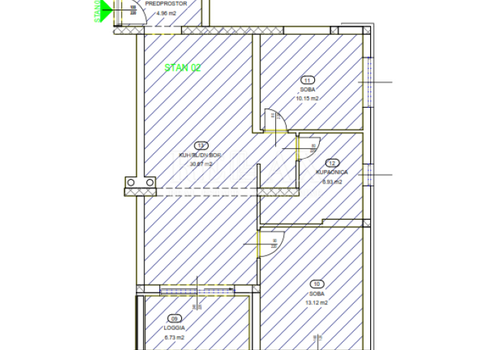 Die Wohnung hat eine Fläche von 72 m2 und besteht aus einer Eingangshalle, Toilette, zwei Schlafzimmern, Küche mit Wohnzimmer, Bad und Loggia.
