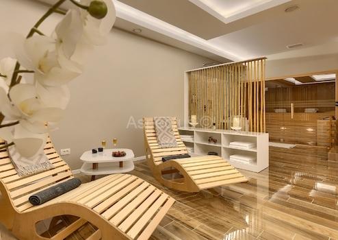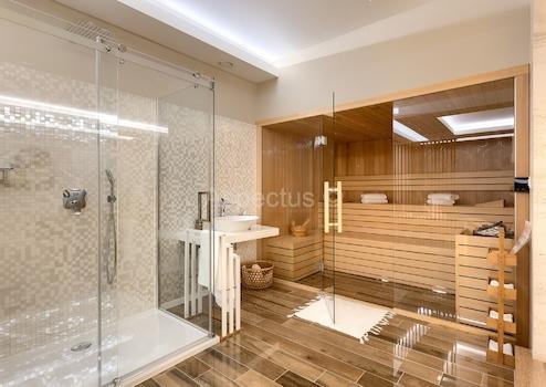 Im Untergeschoss der Villa befindet sich ein grosszügiger und bezaubernder Wellness-, Sauna-, Dusch- und Ruhebereich, ideal zum Entspannen nach einem Saunaaufenthalt bei einem Glas erfrischendem Getränk. Der Wellnessbereich ist mit Halbedelstein-Onyx dekoriert, der den Raum bereichert und die Regeneration fördert.