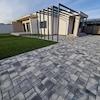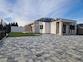 Es hat eine gepflasterte Auffahrt und einen angelegten Garten.