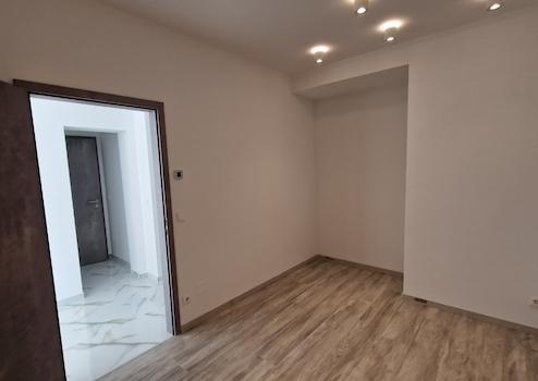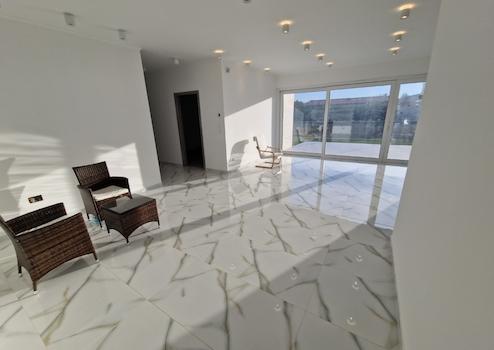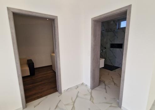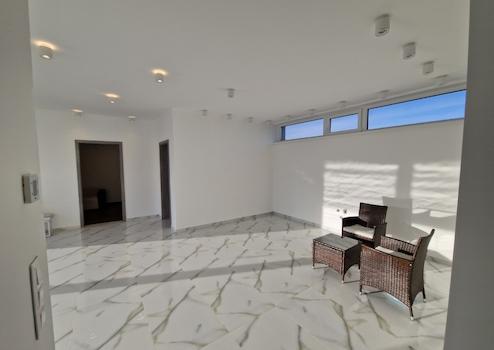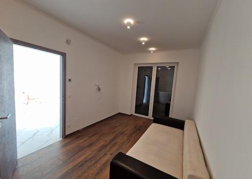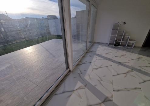 Dann öffnet sich das helle und geräumige Wohnzimmer mit amerikanischer Küche zum dritten Zimmer und Badezimmer mit separatem Technikraum. Die 29 m2 große Terrasse vor dem Eingang und dem Wohnzimmer hat eine gepflasterte Fläche.