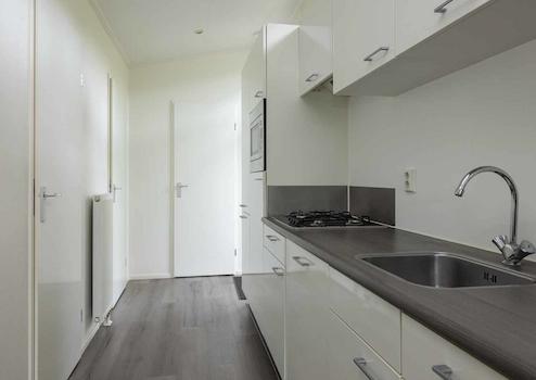 In het hart van de woning bevindt zich de keuken. De open keuken is neutraal afgewerkt en voorzien van moderne inbouwapparatuur (zoals een koelkast, vaatwasser en combinatieoven met magnetronfunctie). Het strakke design draagt bij aan een ruimtelijk gevoel in de woonkamer.