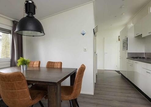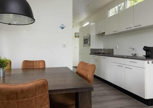 De vakantiewoning biedt verder een prachtige open keuken. Deze keuken is uitgerust met hoogwaardige inbouwapparatuur, waaronder een ruime koelkast, een handige vaatwasser en een veelzijdige combinatie magnetron met hete lucht ovenfunctie. Met overvloedige werkruimte en achterwand is deze keuken zeer netjes afgewerkt en is er onlangs prachtig waterafstotend laminaat van zeer hoge kwaliteit op de vloer gelegd.