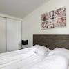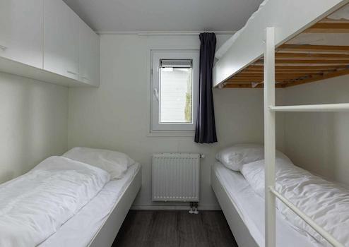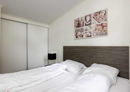 Das großzügige Hauptschlafzimmer ist mit einem äußerst komfortablen Doppelbett und einem geräumigen Einbauschrank mit Schiebetüren ausgestattet, der ausreichend Platz für Ihre Kleidung und persönlichen Gegenstände bietet. Das zweite Schlafzimmer ist praktisch eingerichtet mit einem Einzelbett und einem Etagenbett. Hier gibt es ebenfalls ausreichend Stauraum durch vier Schränke, die geschickt über dem Einzelbett angebracht sind.