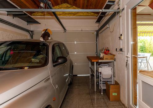 Vom Wintergarten aus gibt es einen direkten Zugang zur 18 qm großen Garage, die über eine Hofeinfahrt mit Hörmann-Automatik-Sektionaltor verfügt.
