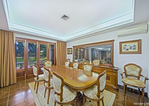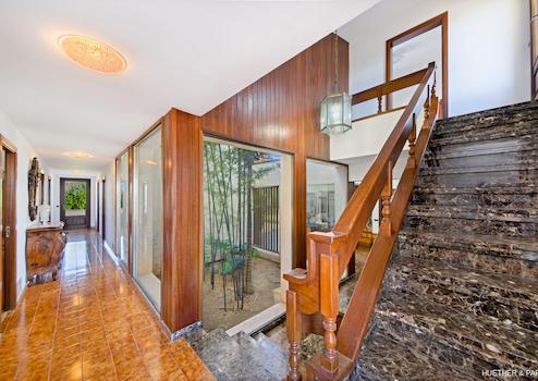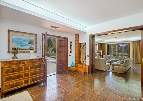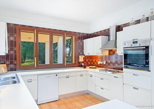 Ein großer Wohnbereich mit Kamin und kleiner Bar, ein großzügiger Essbereich, eine geräumige offene Küche mit einer weiteren Kamin-Ecke sowie ein langer Flur mit mehreren Schlafzimmern und zwei Bädern bilden das Erdgeschoss (im Hochparterre) des Hauses. Ende der 70er Jahre wurde dieses Haus ausgestattet und entsprach damals den modernsten Standards.
