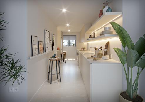 Die Wohnräume sind lichtdurchflutet, mit großen Fenstern, die sich auf großzügige Terrassen öffnen. Die Einbauküche ist offen gestaltet.