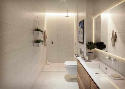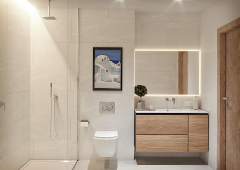 Die Bäder sind mit Waschtischen aus Holz mit einem oder zwei Waschbecken, Dusche mit bodengleicher Duschtasse und Unterputzarmaturen von ausgestattet.