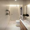 Die Bäder sind mit Waschtischen aus Holz mit einem oder zwei Waschbecken, Dusche mit bodengleicher Duschtasse und Unterputzarmaturen von ausgestattet.