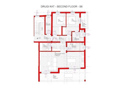 Apartment 6 – zweiter Stock – zwei Schlafzimmer, zwei Badezimmer, WC, Waschküche und Wohnzimmer mit Küche und Esszimmer in einer Einheit, davor eine überdachte Außenterrasse. Zur Wohnung gehört auch ein Parkplatz.