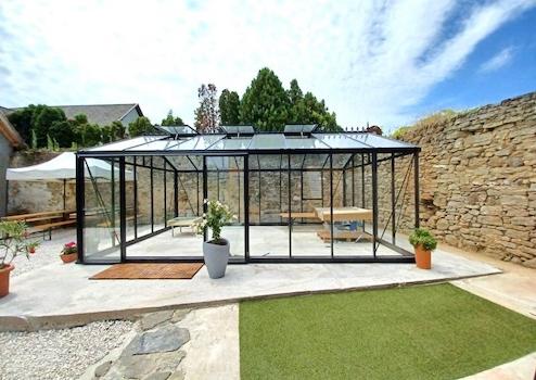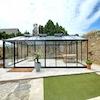 24 qm Gewächshaus vom Typ Helios Master, hergestellt in Belgien. Seitenwände aus gehärtetem Glas, Dach aus gehärtetem Glas, pulverbeschichteter Aluminiumrahmen.