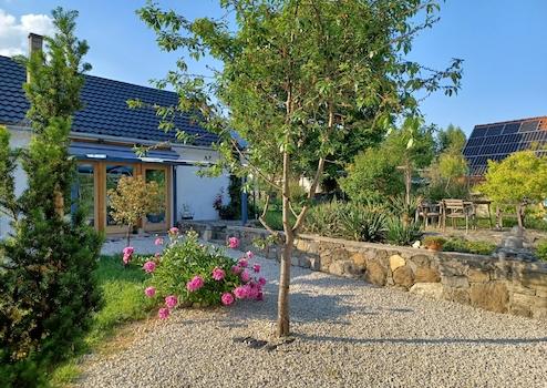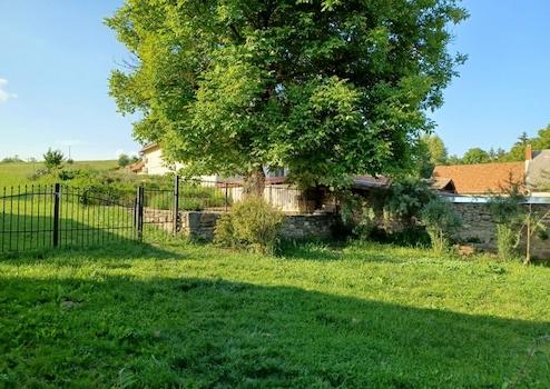 Das Grundstück ist an der Straßenfront mit einem 40 m langen Steinzaun eingefasst, von der Hauptstraße 77 durch zwei Tore zugänglich und umfasst eine Gesamtfläche von 1500 m². Der schön angelegte und gepflegte Garten bietet einen Panoramablick auf die Hügel jenseits des Egervíz-Baches, und der Garten setzt sich in den endlosen Hügeln fort.