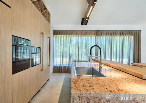 Umgeben von eigenen Olivenhainen dekorierter Garten von 5764m2. Es ist ein äußerst hochwertiger Neubau, der selten auf den Markt kommt. Gebaut nach den höchsten Baustandards mit den hochwertigsten Materialien und Geräten. Die Architektur des Hauses entspricht den heutigen Bautrends. Dieses einzigartige Haus im Erdgeschoss besteht aus insgesamt 280 m2 Wohnfläche, in der sich ein größerer offener Raum befindet, in dem sich ein Wohnzimmer mit Essbereich und eine moderne und gut ausgestattete Küche befinden. Neben der Küche befindet sich ein größerer Abstellraum. Von diesem Raum durch größere Glaswände 2,40 m hoch, 6 m breite Schiebetüren. Es gibt einen direkten Blick auf den Garten und den Pool.
