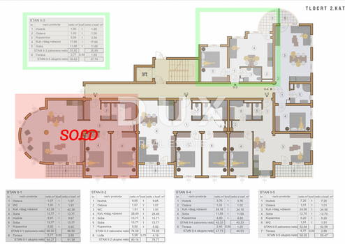 Wir sind stolz, Ihnen ein neues Bauprojekt an einem interessanten Ort in der Stadt Pula vorstellen zu können. Das Gebäude liegt nämlich nur 3 Autominuten vom Stadtzentrum entfernt und auch nur 5 Autominuten vom berühmten Touristenort Verudela. Das Gebäude befindet sich in ruhiger Lage, ohne viel Verkehr in der Nähe seiner für den täglichen Bedarf notwendigen Inhalte. Das Gebäude besteht aus mehreren Wohneinheiten, die sich vom Erdgeschoss des Gebäudes bis zum 3. Obergeschoss erstrecken. Neben dem Gebäude gibt es Parkplätze im Garten des Gebäudes sowie in der Garage des Gebäudes. Zukünftige Wohnungseigentümer haben die Möglichkeit, einen Parkplatz für ihre Haustiere zu wählen. BESCHREIBUNG DER WOHNUNG; Somit sind wir stolz, Ihnen in diesem Gebäude eine Wohnung im 2. Obergeschoss präsentieren zu können, die insgesamt über 37,74m2 NETTO-Nutzfläche verfügt. Die Wohnung ist so organisiert, dass der Eingang zur Wohnung über einen Flur verfügt, der den Wohnungsraum in einen privaten Raum und einen Raum für das tägliche Leben und Unterhaltung trennt. So befinden sich im privaten Bereich der Wohnung 1 geräumiges Schlafzimmer, ein größeres Badezimmer und ein kleinerer Abstellraum. Der Raum für das tägliche Leben ist als größerer „Open Space“-Raum konzipiert und verfügt über eine geräumige Küche, ein gemütliches Esszimmer und ein größeres Wohnzimmer. Der gesamte Raum ist mit natürlichem Licht durchflutet, das durch große Glaswände in die Wohnung eindringt. Vom Wohnzimmer gibt es einen Ausgang zur Außenterrasse. * Kunden haben die Möglichkeit, einen Parkplatz entweder im Garten des Gebäudes oder im Garten des Gebäudes zu kaufen; - Parkplatz im Garten des Gebäudes; 8.290,00 € - Parkplatz im Garten je nach Quadratmeterzahl: von 21.670,00 € bis 49.390,00 € - Abstellraum je nach Quadratmeterzahl; von 10.430,00 € bis 13.990,00 € TECHNISCHE UND WEITERE DATEN; * Jede Wohnung im Gebäude wird mit einer elektrischen Fußbodenheizung ausgestattet. * Hochwertige PVC-Tischlerei wird installiert. * Fassadendämmung 10 cm. * Das Gebäude verfügt über einen Aufzug, der die Garage mit jeder Etage des Gebäudes verbindet. * Hochwertige Keramik wird installiert auf den Böden installiert (Kunden haben vorerst die Möglichkeit, Einfluss zu nehmen!) * Einzugsmöglichkeit ist für Anfang 2025 geplant. STANDORTBESCHREIBUNG; Das Gebäude befindet sich in ruhiger Lage in der Stadt Pula, nur 3 Autominuten vom Stadtzentrum und nur 5 Autominuten vom berühmten Touristenort Verudela entfernt. Auf Verudela finden Sie zahlreiche Fels- und Steinstrände mit kristallklarem Meer, und in unmittelbarer Nähe des Gebäudes gibt es zahlreiche Restaurants, Cafés, sowie einen Markt, neben dem Gebäude gibt es auch einen kleinen Laden, sowie alles, was Sie für einen sicheren und ruhigen Alltag des modernen Menschen benötigen. Kurz gesagt, es handelt sich um eine Immobilie, die Ihre Aufmerksamkeit verdient und als ideale Option für eine private Investition oder als Option für ein echtes Einfamilienhaus dienen kann. Für weitere Fragen, notwendige Informationen oder den Wunsch, einen Termin zur Besichtigung des Standortes und des aktuellen Baustatus zu vereinbaren, nehmen Sie gerne Kontakt mit uns auf! Sehr geehrte Kunden, die Agenturprovision wird gemäß den Allgemeinen Geschäftsbedingungen berechnet: www.dux-nekretnine.hr/opci-uvjeti-poslovanja