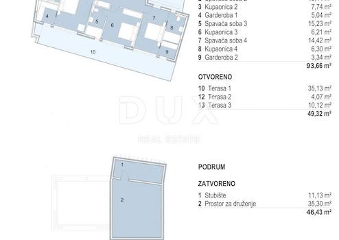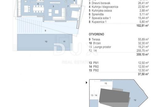 Eine wunderschöne Villa zum Verkauf auf der Insel Pag in Novalja, ca. 500 m vom Meer entfernt, mit Swimmingpool und großem Garten. Die Villa besteht aus einem Erdgeschoss und einer Etage. Es besteht aus: ERDGESCHOSS: Eingangsbereich, Toilette, Wohnzimmer, Küche und Esszimmer, Speisekammer, Abstellraum, Schlafzimmer, Badezimmer, Terrasse, Swimmingpool, Wohnbereich, Garten, 3 Parkplätze. 1. STOCK: Flur, 3 Schlafzimmer, 2 Kleiderschränke, 3 Badezimmer, 3 Terrassen, Treppenhaus, Sozialbereich. Außerdem gibt es einen Infinity-Pool mit Poollounge, einer Liegewiese und einer großen Terrasse. Die verwendeten Materialien sind von höchster Klasse. Keramik und Sanitärartikel, Multi-Klimaanlagen, Fußbodenheizung, Aluminiumschreinerei. Sehr geehrte Kunden, die Agenturprovision wird gemäß den Allgemeinen Geschäftsbedingungen www.dux-nekretnine.hr/opci-uvjeti-poslovanja berechnet