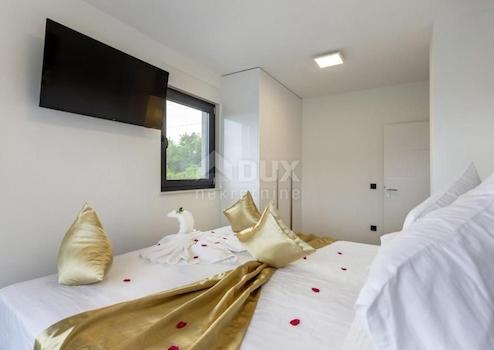 In einem kleinen ruhigen Ort 10 km vom Meer entfernt befindet sich dieser schöne Neubau im modernen Design mit einer Wohnfläche von 120m2. Das Anwesen befindet sich auf einem Hügel mit Panoramablick auf den Berg Učka. Das Grundstück ist komplett eingezäunt und bietet absolute Privatsphäre. Auf einem Grundstück von 2.869 m2 befindet sich ein zweistöckiges Haus, ein Nebengebäude mit Schwimmbad und ein großzügiger Spielplatz mit verschiedenen Einrichtungen. Es ist umgeben von Olivenhainen, Bäumen und anderer unberührter Natur. Das Erdgeschoss verfügt über eine Küche, Esszimmer, Wohnzimmer, Bad und Ausgang zu einer überdachten kleinen Terrasse und einer größeren Terrasse mit Sonnendeck, Pool und zusätzlicher Einrichtung. Im Obergeschoss gibt es eine Eisentreppe, in der sich drei komfortable Schlafzimmer und ein Badezimmer befinden. Die Umgebung des Hauses schmücken ein Swimmingpool mit Sonnendeck, eine schöne Liegewiese, ein Sportplatz und eine zusätzliche Einrichtung mit Esstisch, Küche und WC. Großer Garten, modernes Design und Lage machen dieses Anwesen ideal für einen Urlaub.