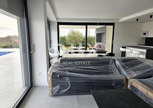 INSEL KRK, KRK (Umgebung) - Luxusvilla mit mediterranem Garten und Swimmingpool Auf der Insel Krk, in einer ruhigen Gegend, 5 Autominuten vom Zentrum von Krk entfernt, steht eine außergewöhnliche Villa aus dem Jahr 2023 zum Verkauf am Rande des Dorfes. Die Villa hat eine Wohnfläche von 210 m2 und wurde als zweistöckiges Haus auf einem großen Garten gebaut. Im Erdgeschoss befinden sich ein Eingangsbereich, ein Abstellraum, ein Gäste-WC, ein geräumiges Wohnzimmer, ein Esszimmer und eine Küche. Die Küche hat Zugang zu einer überdachten Terrasse von 40 m² mit Zugang zum Pool und Garten, wo sich auch ein Abstellraum im Freien befindet. Eine Innentreppe verbindet das Erdgeschoss mit dem ersten Stock, wo sich 3 Schlafzimmer mit eigenem Bad, eine Waschküche und ein Fitnessbereich mit Zugang zur Loggia befinden. Die Schlafzimmer bieten einen schönen Blick ins Grüne und auf das Meer. Die Luxusvilla verfügt über hochwertige PVC-Tischlerei, einbruchsichere Eingangstüren, keramische Bodenbeläge und hochwertige Sanitäranlagen. Es ist klimatisiert und verfügt über Fußbodenheizung im Erdgeschoss und im Obergeschoss in den Badezimmern. Im Garten gibt es 4 Parkplätze, davon 2 überdacht. Luxusimmobilie, ruhig gelegen, 3 km vom Meer entfernt! Einholung einer Nutzungsgenehmigung läuft. *** Sehr geehrte Kunden, die Agenturprovision wird gemäß den Allgemeinen Geschäftsbedingungen berechnet: www.dux-nekretnine.hr/opci-uvjeti-poslovanja