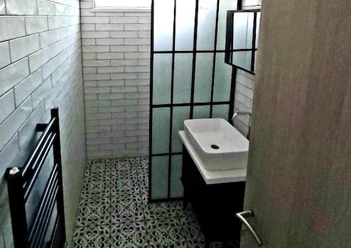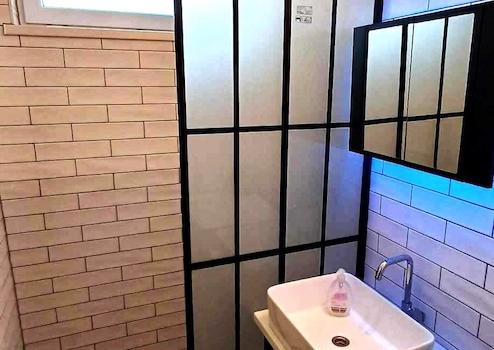 Dusche mit Waschbecken und Waschmaschinenanschluss