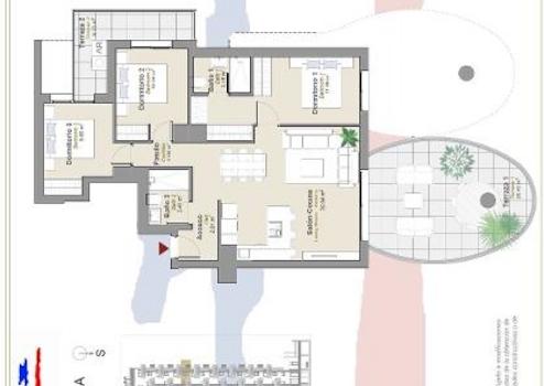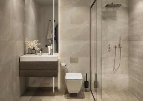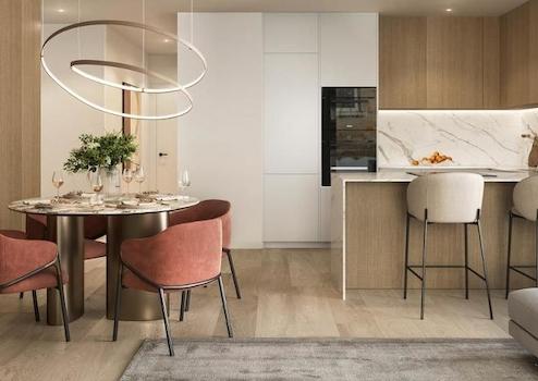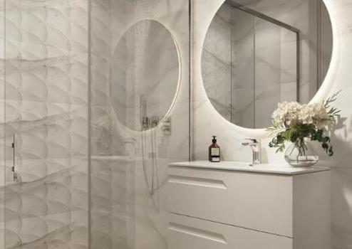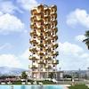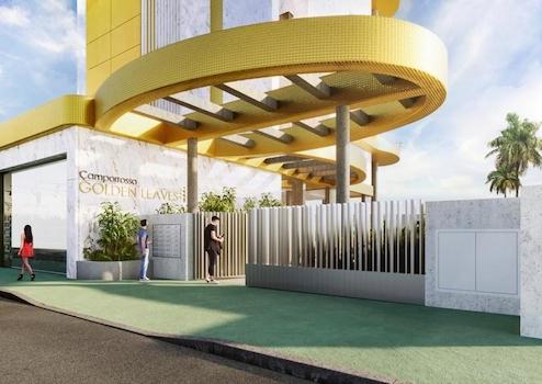 Die Architektur der Wohnung ist von moderner Eleganz geprägt, mit Keramikverkleidungen in weißer und goldener, marmorartiger Textur. Die Terrassen sind wie Blätter gestaltet und mit auffallend leuchtendem und mutigem Gold emailliert, was einen Hauch von Luxus und Raffinesse verleiht.