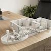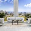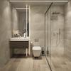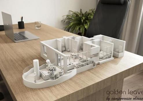 Die Architektur der Wohnung ist von moderner Eleganz geprägt, mit Keramikverkleidungen in weißer und goldener, marmorartiger Textur. Die Terrassen sind wie Blätter gestaltet und mit auffallend leuchtendem und mutigem Gold emailliert, was einen Hauch von Luxus und Raffinesse verleiht.