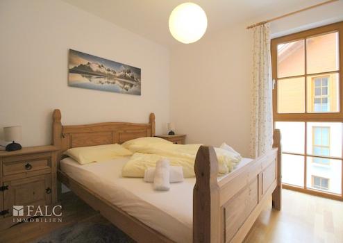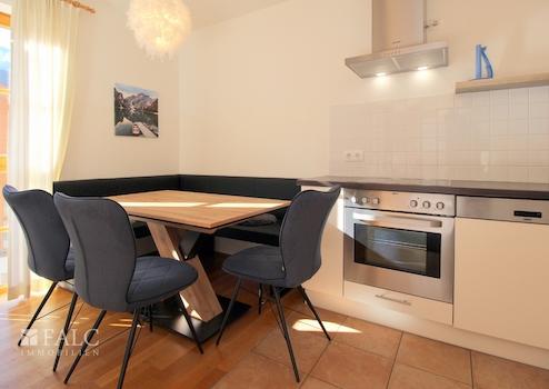 Aufgeteilt ist die Wohnung in eine offene Küche im Wohn- und Essbereich mit Ausgang auf den nach Südwesten ausgerichteten Balkon mit Blick in die Berge und auf den Skihang. Drei Schlafzimmer, zwei Badezimmer, davon eines mit Duschwanne sowie zwei Waschbecken und das andere mit Dusche ergänzt durch ein separates WC runden das durchdachte Raumkonzept ab.