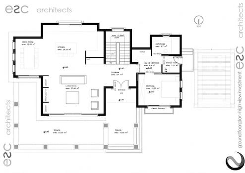 Im Erdgeschoss, mit offener Küche, Esszimmer, Wohnzimmer, Schlafzimmer, Gäste-WC, Terrasse und Pool, 1 ensuite im Obergeschoss, insgesamt 2 Schlafzimmer (mit drei verschiedenen Typen), Bad-WC, 1 Terrasse, Treppe, insgesamt 185 m2 und mit fast 140 m2 Baufeld (ohne TYP C)