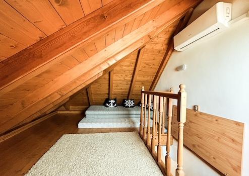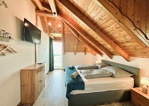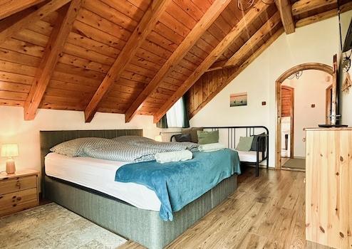 Schlafzimmer mit offener Balkendecke