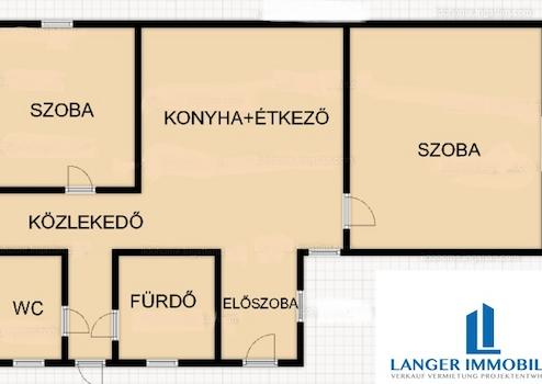 - az ingatlan felosztása 2 szoba + egy konyha+étkező , egy fürdő + WC illetve egy közlekedő