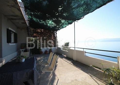 Omiš, Umgebung, Čeline Zavode, Doppelhaushälfte mit einer Wohnfläche von ca. 95 m2, auf einem Grundstück von 600 m2, 1. Reihe vom Meer.Es besteht aus zwei Schlafzimmern, Küche, Esszimmer und 2 Badezimmern mit WC.Grosse Terrasse.Grundstück von 298 m2 zum Parken vorgesehen.2 Anschlüsse und eine alte Mulde.Baujahr 1988Für Renovierung und Erweiterung!