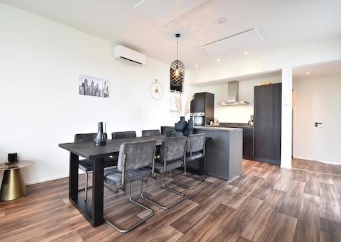 Herrlich geräumiges Wohnzimmer mit Blick auf das Wasser. Die großen Fenster sorgen für viel Licht und die Schiebetüren öffnen sich auf die Terrasse. Schöne Fußböden in einer warmen Holzfarbe und dimmbare Einbaustrahler an der Decke. Das Haus wird mit Infrarot-Wärmepaneelen beheizt, die im gesamten Haus verwendet werden. Das Wohnzimmer hat auch eine Split-Klimaanlage, die sowohl im Sommer als auch im Winter sehr angenehm ist. Die Einrichtung ist sehr schön und modern. Sie werden sich hier wie zu Hause fühlen.