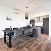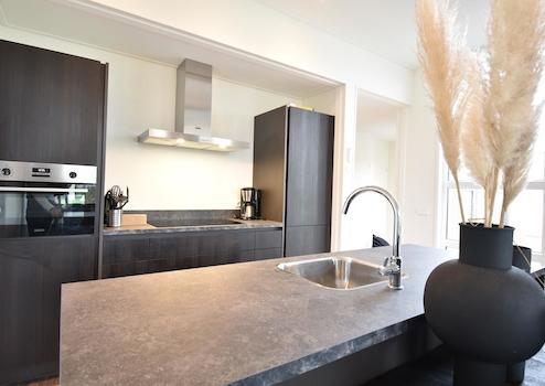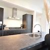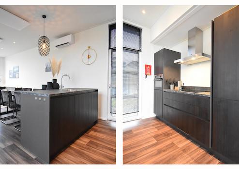 Die Küche befindet sich an der Rückwand mit einer Insel, auf der sich die Spüle und der Geschirrspüler befinden. Eine dunkle, moderne Küche, die perfekt zum Stil des Chalets passt. Wir finden auch eine Kombination aus Mikrowelle, Induktionskochfeld, Kühlschrank und Gefrierschrank mit 3 Schubladen. Alle Geräte sind von Zanussi.