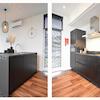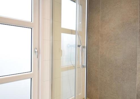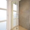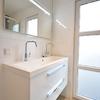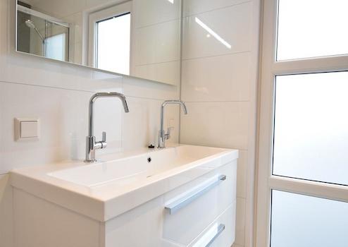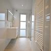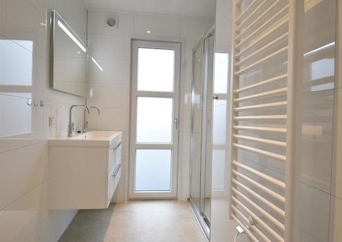 Gepflegtes Bad mit einem Waschbecken mit Schrank und einem Spiegel darüber. Hängende Toilette, Duschkabine und ein Design-Heizkörper. In diesem Raum gibt es eine elektrische Belüftung.