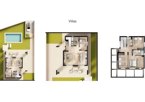 Die wunderschönen Immobilien mit hervorragender Ausstattung sind Teil einer sehr schönen Wohnanlage mit Pool, privaten Pkw-Stellplätzen, Abstellräumen, Gartenanlagen und einem Kinderspielplatz. Für die Bewohner der Appartements steht ein Gemeinschaftspool zur Verfügung, für die Reihenhäuser und Villen gibt es optional einen eigenen Pool.
