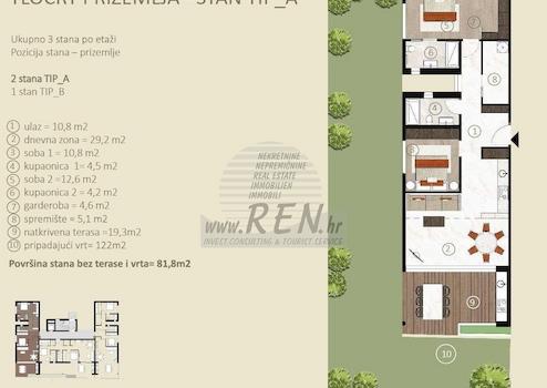 Wohnung 1 in Novigrad hat insgesamt 81,8 m2 ohne Terrasse + 122 m2 Garten, befindet sich im Erdgeschoss, Bauphase, 5 min. (1000 m) vom Meer und vom wunderschön angelegten Strand entfernt, 5 Min. (1000 m) vom Zentrum von Novigrad entfernt. Die Wohnung besteht aus einer Küche/Wohnzimmer/Esszimmer, 2 Schlafzimmern, 2 Bädern, Abstellraum, Garderobe, Terrasse 19,30 m2. Besonderheiten der Wohnung: