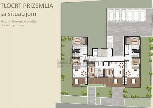 Wohnung 2 in Novigrad hat insgesamt 80,7 m2 ohne Terrasse + 26 m2 Garten, befindet sich im Erdgeschoss, Bauphase, 5 min. (1000 m) vom Meer und vom wunderschön angelegten Strand entfernt, 5 Min. (1000 m) vom Zentrum von Novigrad entfernt. Die Wohnung besteht aus einer Küche/Wohnzimmer/Esszimmer, 2 Schlafzimmern, 2 Bädern, 2 Abstellraum, Garderobe, Terrasse 51,80 m2. Besonderheiten der Wohnung: