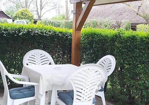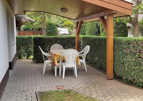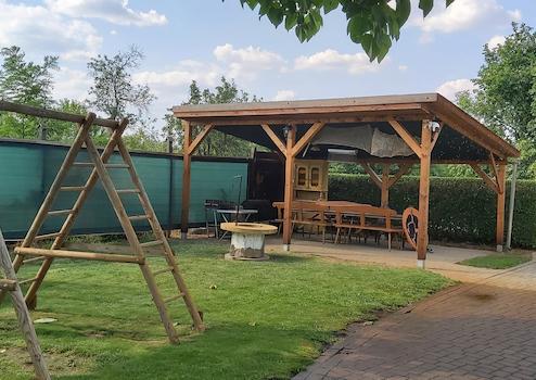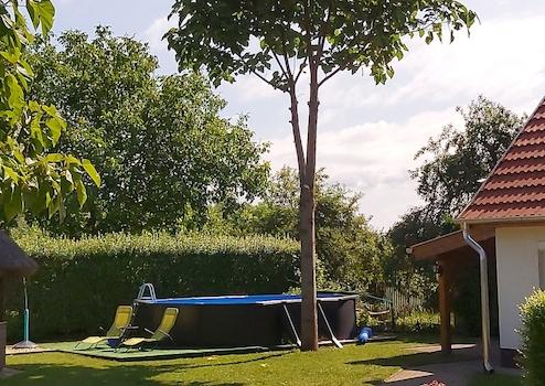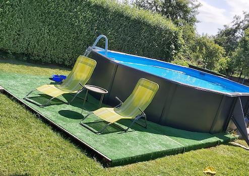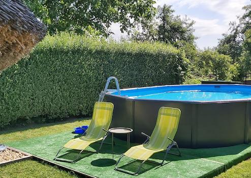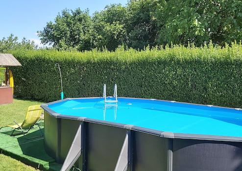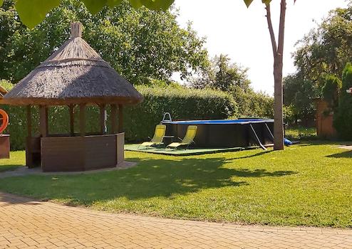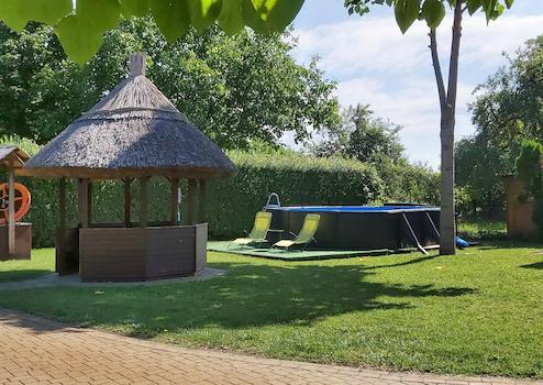 Az épületektől távolabb egy 7x3 medence és egy nagyobb fedett kiülő (bogrács, grillező hely) áll a vendégek rendelkezésére.