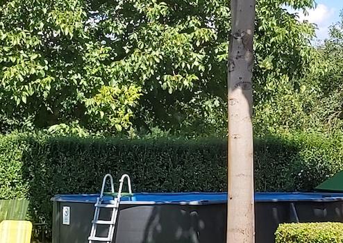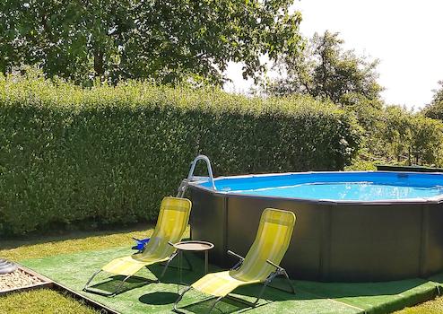 Weiter entfernt von den Gebäuden gibt es einen 7x3 großen Swimmingpool und eine größere überdachte Terrasse (Grill, Grillplatz).