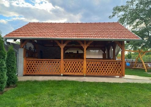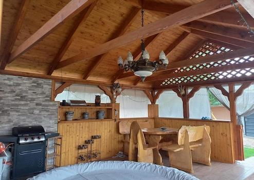 A házhoz 80 m2 műhely is tartozik, ami szigetelt és elektromos fűtéssel van ellátva, radiátorok adják a meleget. Egy 40 m2 kiülő is tartozik a házhoz, valamint 30 m2 fatároló.