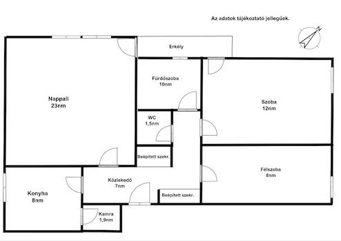 Helyiségei: nappali, konyha, kamra, közlekedő, fürdőszoba, külön WC, szoba, félszoba, plusz: 16,8 nm garázs. A közlekedőben 2db beépített szekrény található, jól kihasználható belső térrel. Az erkély a nappaliból és a szobából is elérhető.