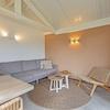 Schönes, gemütliches Wohnzimmer, das durch die große Fassade mit Fenstertüren nach außen gerichtet ist und den Blick nach draußen freigibt. Die hohe Decke lässt es sehr geräumig erscheinen. Auf dem 3-Sitzer-Sofa und dem Relax-Sessel können Sie ein gutes Buch oder die Natur genießen, während Sie nach draußen schauen.