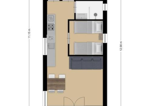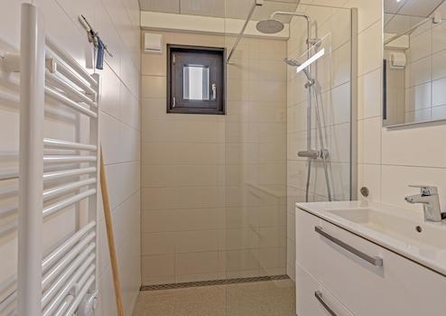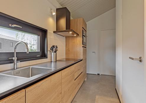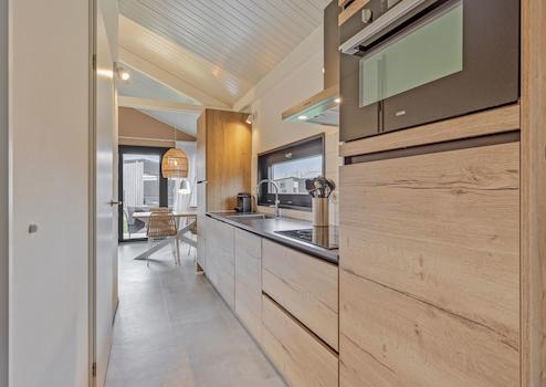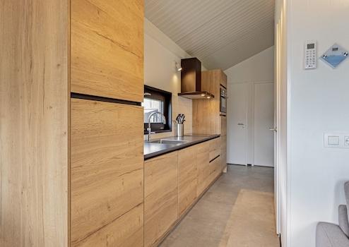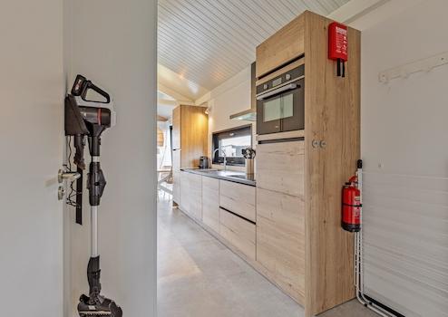 Die Küche ist in einem geraden Layout in einer schönen warmen Holzfarbe mit einer kontrastierenden Platte. Die Küche ist kompakt, aber komplett ausgestattet. Wir finden eine Kombination aus Mikrowelle, Kühlschrank mit Gefrierfach, Induktionskochfeld und Geschirrspüler.