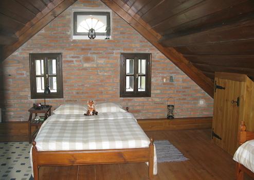 A tetőtérben egy előtér, két nagy szoba és két zuhanyzó + wc helyezkedik el. A melléképület felső részén egy nagyméretű vendégszoba + fürdőszoba kapott helyet, alsó részét képezi a garázs, egy nyári konyha, fatároló.