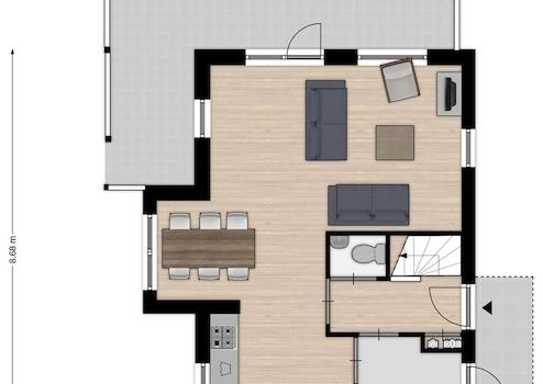 Das Wohnzimmer ist gemütlich und heimelig. Dieser Raum ist in einen Sitz- und einen Essbereich unterteilt. Dank der großen Fenster und Gartentüren haben Sie viel Tageslicht in diesem Raum. Durch die Gartentüren gelangen Sie auf die Veranda, wo Sie die Aussicht, die Ruhe, ein gutes Buch oder einen Snack und ein Getränk genießen können. Wenn es kühl ist, können Sie sich an den elektrischen Kamin setzen, wie gemütlich ist das denn!