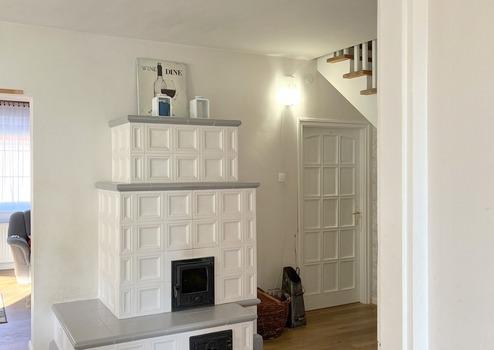 Modernes Heizsystem: Gas-Umlaufheizkörper mit Wärmestrahlern sorgen für eine angenehme Temperatur, und im Wohnzimmer bietet ein ästhetischer Kachelofen die alternative Heizmethode und sorgt für die Wärme und gemütliche Atmosphäre, die nur ein Kachelofen bieten kann.