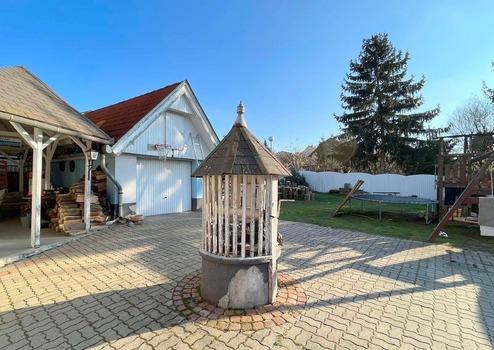 Kert: A sík, körbekerített terület lehetőséget nyújt konyhakert vagy akár egy medence kialakítására, de családi, baráti együttlétek kiváló helyszíne is lehet, főképpen a ház és a garázs között kialakított kerti kiülő által. Az udvaron található fúrt kút pedig alternatív lehetőséget biztosít a pázsit és a növények öntözésére.