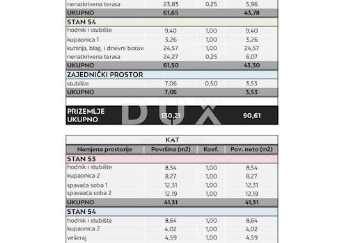 Eine im Bau befindliche zweistöckige Wohnung in Rtina bei Zadar steht zum Verkauf. Die Wohnung mit einer Gesamtfläche von 78,59 m2 besteht aus Erdgeschoss und Obergeschoss eines kleineren Wohnhauses mit 4 Wohneinheiten. Im Erdgeschoss gibt es ein geräumiges Wohnzimmer, Küche und Esszimmer, Badezimmer und eine nicht überdachte Terrasse von 24 m2 mit freiem Blick auf das Meer. Eine Innentreppe führt in den ersten Stock, wo sich zwei Schlafzimmer, ein Badezimmer und eine Waschküche befinden. Zur Wohnung gehört ein Parkplatz im Innenhof des Gebäudes. Die Wohnung ist voll klimatisiert, als Bodenbeläge wurden hochwertige Keramikfliesen verwendet. Für die Zimmerei wurden Fensterläden aus dreischichtigem Glas und Aluminium verwendet, und die Eingangstür ist einbruchhemmend. Die Wohnung ist nach Süden ausgerichtet und befindet sich in einer äußerst attraktiven Lage, 180 m vom Meer entfernt. In der Umgebung gibt es viele weitere interessante Orte wie Vrsi, Privlaka oder die historische Stadt Nin, die 20 km entfernt liegt. In unmittelbarer Nähe liegt die Insel Pag, die flächenmäßig fünftgrößte Insel der Adria und mit einer Küstenlänge von 302,47 km die am stärksten gegliederte Insel der Adria. Die Insel ist für ihre in einigen Teilen spärliche Vegetationsbedeckung bekannt, die oft mit der Oberfläche des Mondes verglichen wird. Die felsige Landschaft mit nur wenigen Blättern aromatischer Pflanzen, die von Schafen abgegrast werden, vermittelt einen einzigartigen Eindruck. Sehr geehrte Kunden, die Agenturprovision wird gemäß den Allgemeinen Geschäftsbedingungen www.dux-nekretnine.hr/opci-uvjeti-poslovanja berechnet