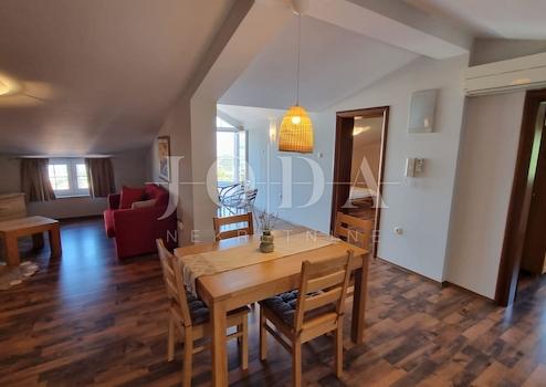 Zum Verkauf steht eine außergewöhnliche Wohnung im Dachgeschoss eines Hauses mit vier Wohnungen, die die perfekte Kombination aus Privatsphäre und einem herrlichen Blick auf das Meer und den Kvarner bietet. Dieses Haus besteht aus einem Erdgeschoss, zwei Etagen und einem Dachgeschoss, und die angebotene Wohnung befindet sich in einer einzigartigen Lage, die einen unglaublichen Eindruck von Geräumigkeit und Komfort bietet.