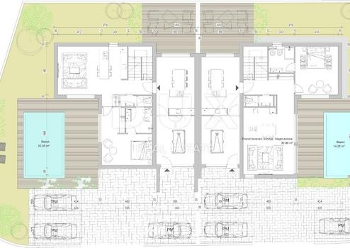 Direkt in Pomer steht eine moderne Doppelhaushälfte mit einem Pool von 228 m2 zum Verkauf. Das Haus besteht aus zwei Etagen. Im Erdgeschoss gibt es einen Flur, ein Schlafzimmer mit Bad, WC, ein Wohnzimmer mit Esszimmer und Küche in einem Teil und eine Terrasse, die sich zu einem 20 m² großen Pool öffnet. Im Obergeschoss befinden sich zwei weitere Schlafzimmer, jedes mit eigenem Bad und Terrasse. Ausgezeichnete Lage, hochwertige moderne Konstruktion, gerade Linien. Es ist möglich, 3 Autos im Hof des Grundstücks zu parken. Das Anwesen ist ideal entweder für einen Sommerurlaub oder zum ganzjährigen Wohnen. Das Anwesen befindet sich in einer ruhigen Bucht in der Nähe von ACI Marina Pomer und 20 Gehminuten von den ersten Stränden entfernt. In der Nähe von Medulin und dem Zentrum von Pula sowie dem Flughafen Pula, ca. 15 Autominuten entfernt.